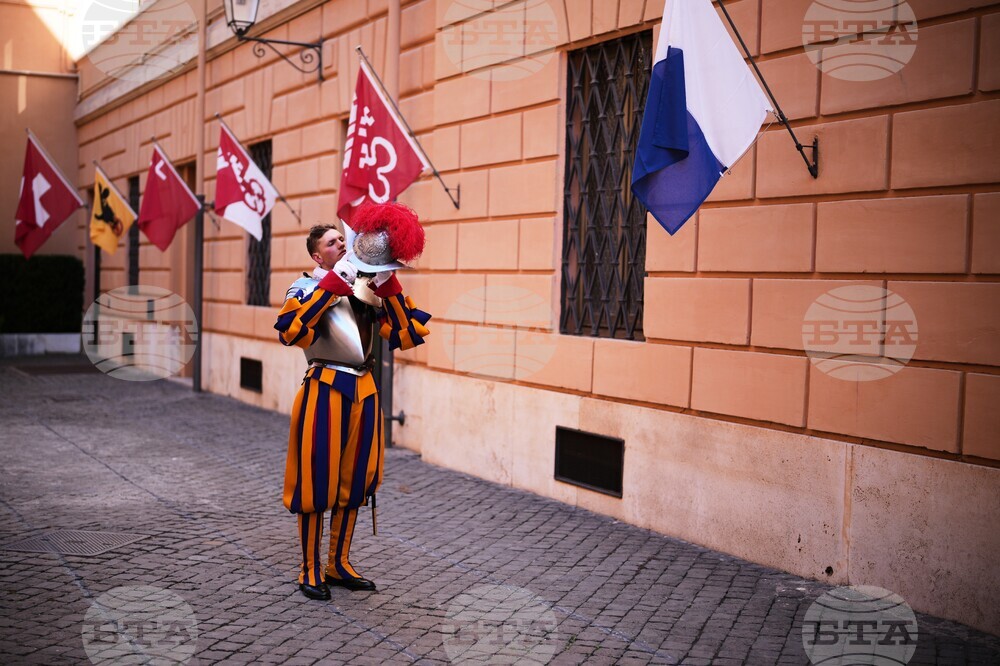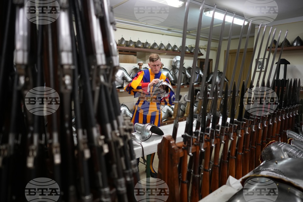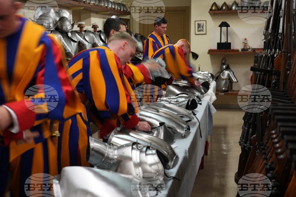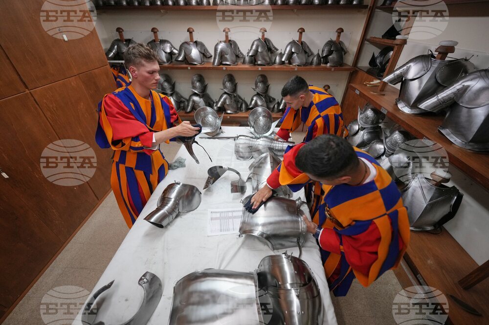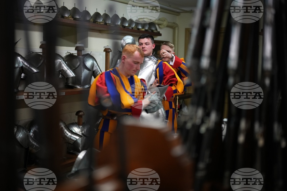 Pontifical Swiss Guards prepare ahead of their swearing in ceremony, at the Vatican, Saturday, Oct. 4, 2025. (AP Photo/Andrew Medichini)