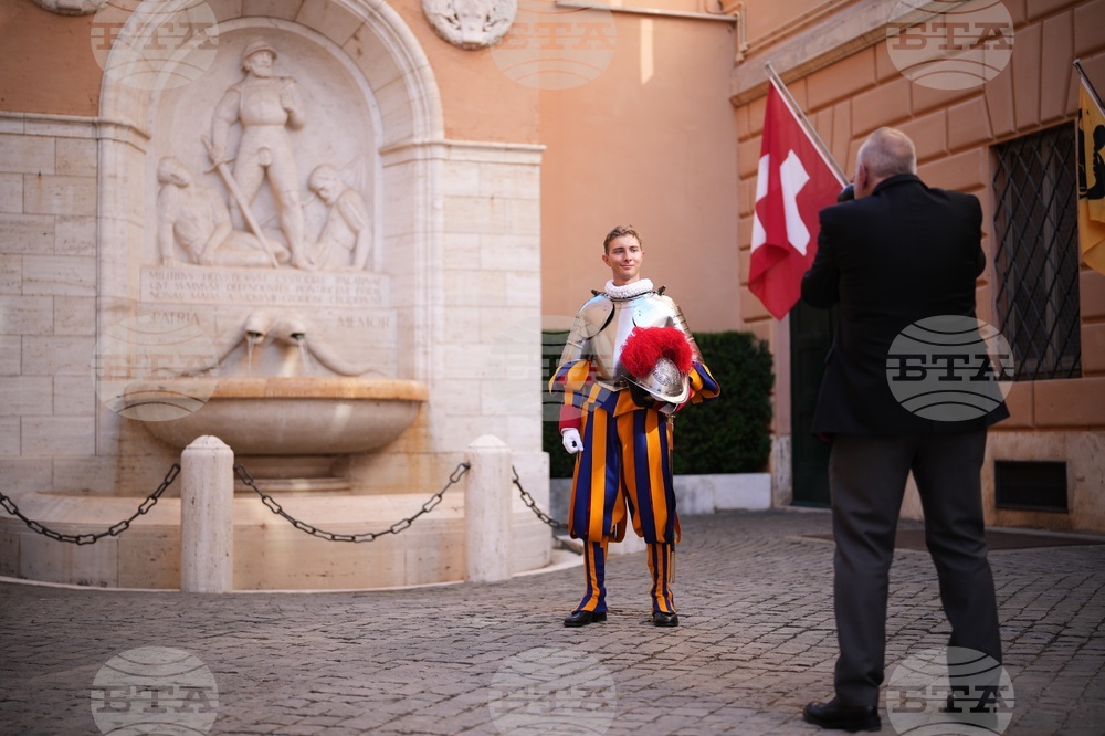 A Pontifical Swiss Guards has a photo taken ahead of his swearing in ceremony, at the Vatican, Saturday, Oct. 4, 2025. (AP Photo/Andrew Medichini)