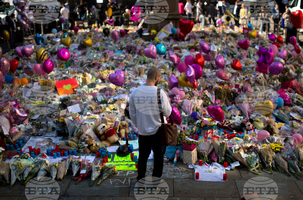 FILE - A man stands next to flowers for the victims of a bombing at St. Ann's Square in central Manchester, England, May 26, 2017. (AP Photo/Emilio Morenatti, File)