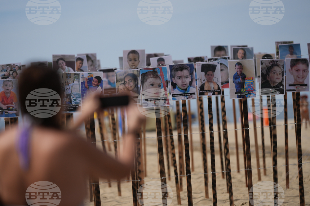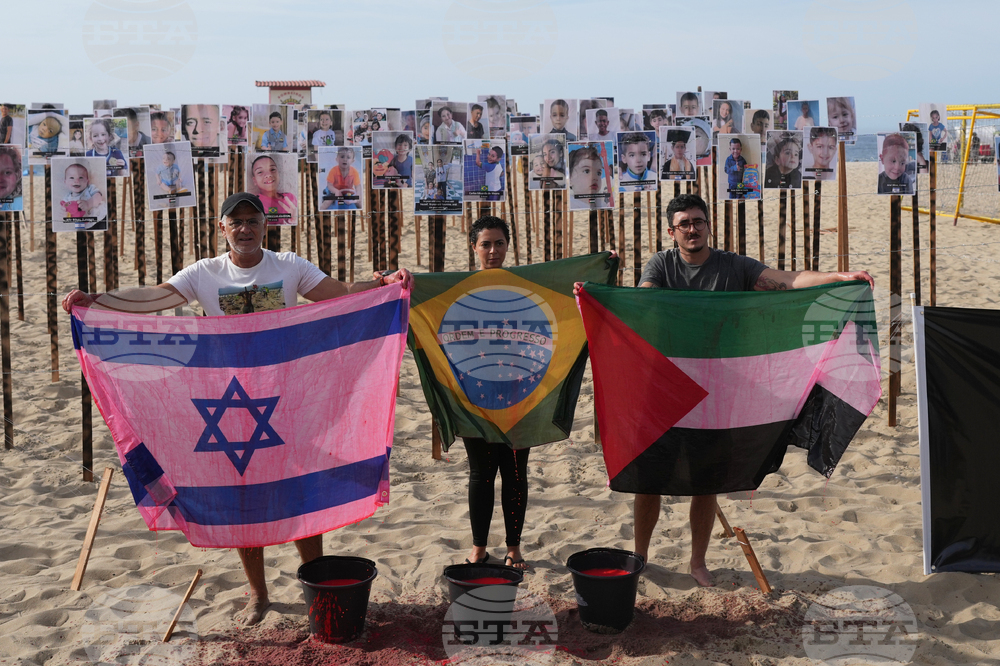 Activists take part in a demonstration in memory of children who were victims of violence in Gaza, Israel and Rio de Janeiro, ahead of the second anniversary of the Gaza war, on Copacabana beach, in Rio de Janeiro, Saturday, Oct. 4, 2025. (AP Photo/Silvia Izquierdo)