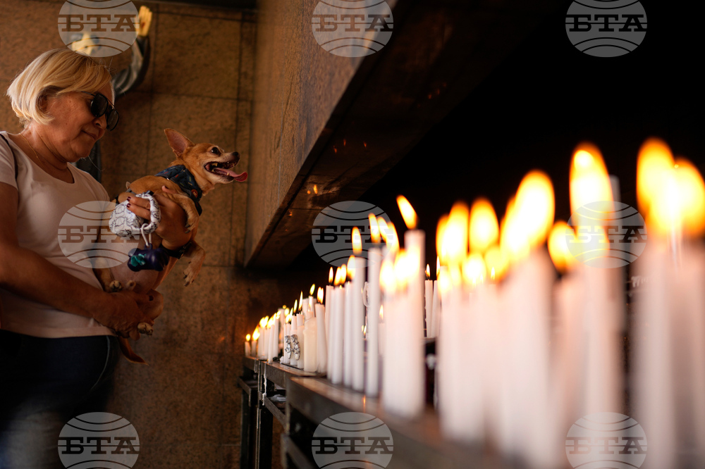 A owner and her dog wait near candles before a Mass in honor of Saint Francis of Assisi, considered the protector of animals, on the Saint's feast day, in Brasilia, Brazil, Saturday, Oct. 4, 2025. (AP Photo/Eraldo Peres)
