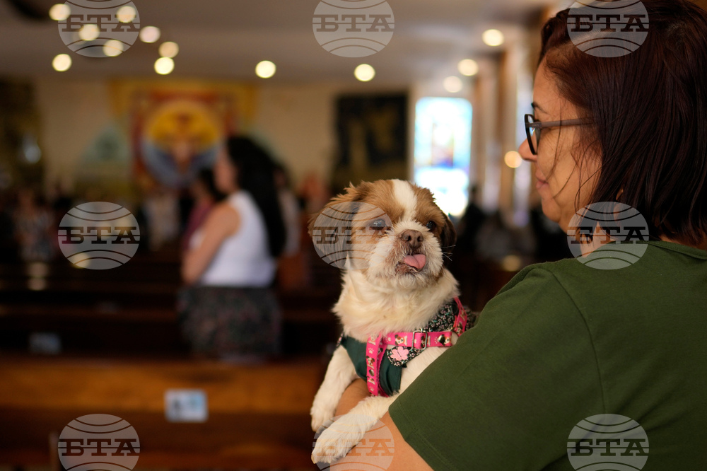 A dog waits to receive blessings during a Mass in honor of Saint Francis of Assisi, considered the protector of animals, on the Saint's feast day, in Brasilia, Brazil, Saturday, Oct. 4, 2025. (AP Photo/Eraldo Peres)