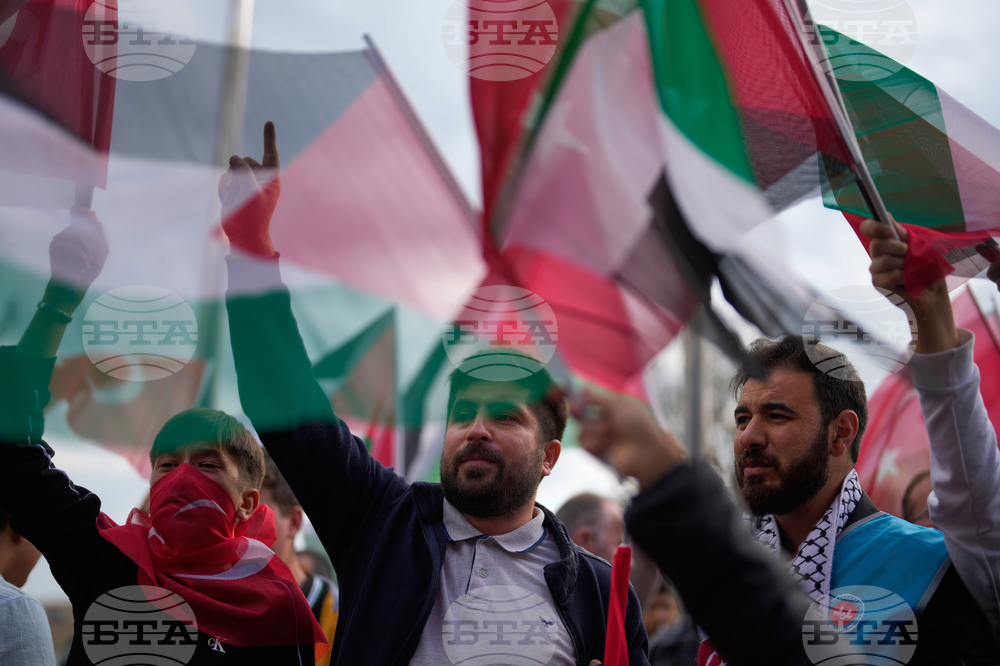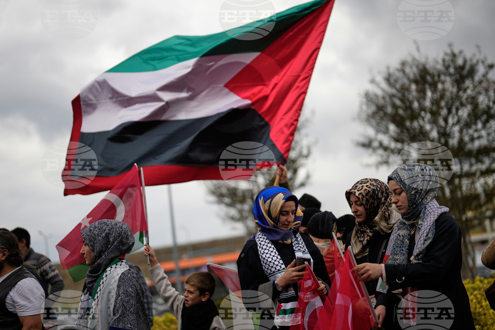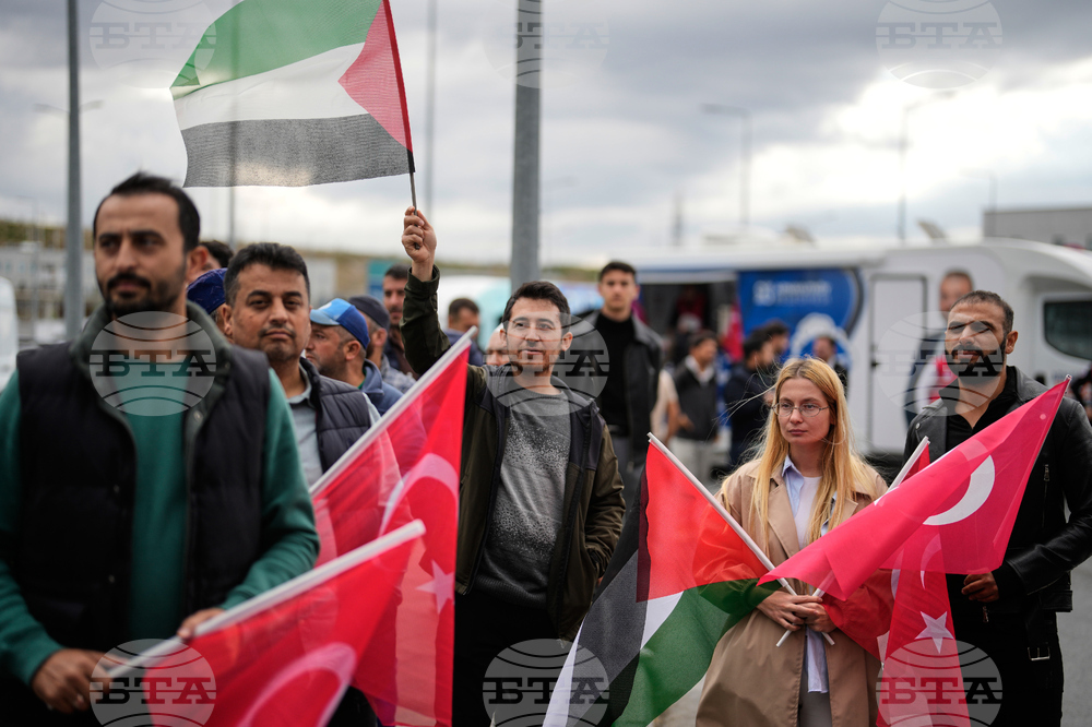People wave Turkish and Palestinian flags as they gather outside Istanbul Airport, waiting for the arrival of 137 activists from the Global Sumud Flotilla, in Istanbul, Turkey, Saturday, Oct. 4, 2025. (AP Photo/Khalil Hamra)