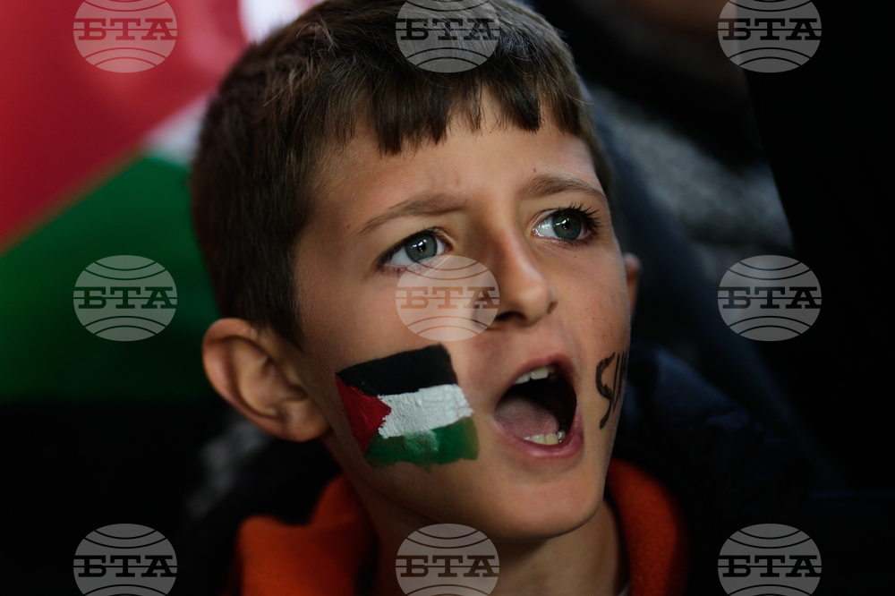 A boy with a Palestinian flag painted on his face chants slogans during a gathering outside Istanbul Airport, as people wait for the arrival of 137 activists from the Global Sumud Flotilla, in Istanbul, Turkey, Saturday, Oct. 4, 2025. (AP Photo/Khalil Hamra)