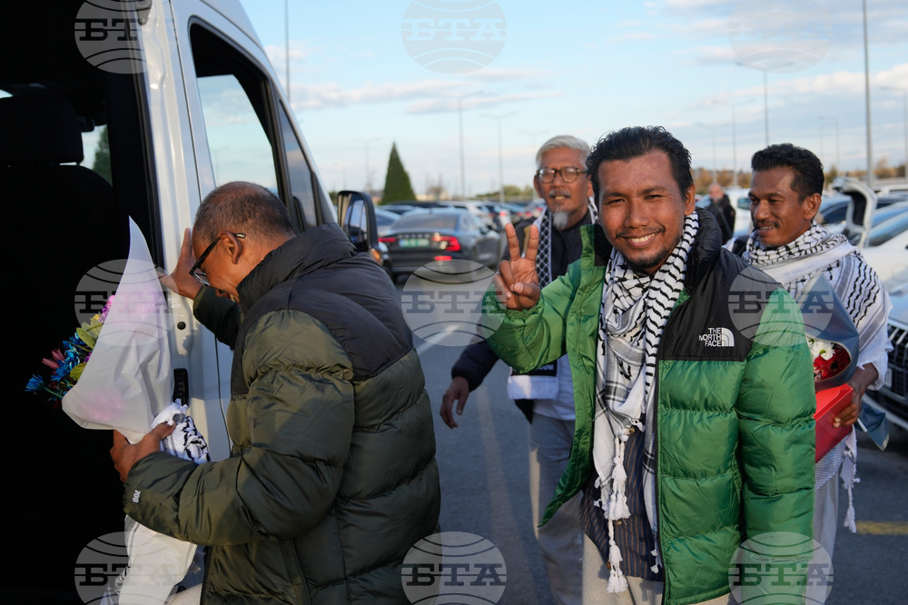 Malaysian activists from the Global Sumud Flotilla react after arriving at Istanbul Airport in Istanbul, Turkey, Saturday, Oct. 4, 2025. (AP Photo/Khalil Hamra)