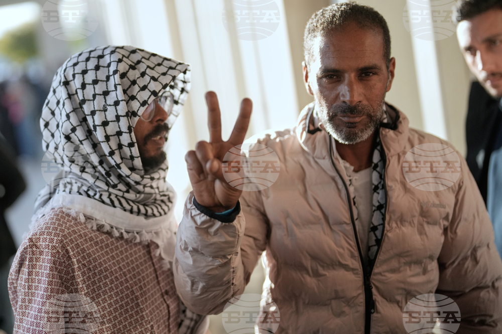 Kuwaiti activists from the Global Sumud Flotilla smile as they arrive at Istanbul Airport in Istanbul, Turkey, Saturday, Oct. 4, 2025. (AP Photo/Khalil Hamra)
