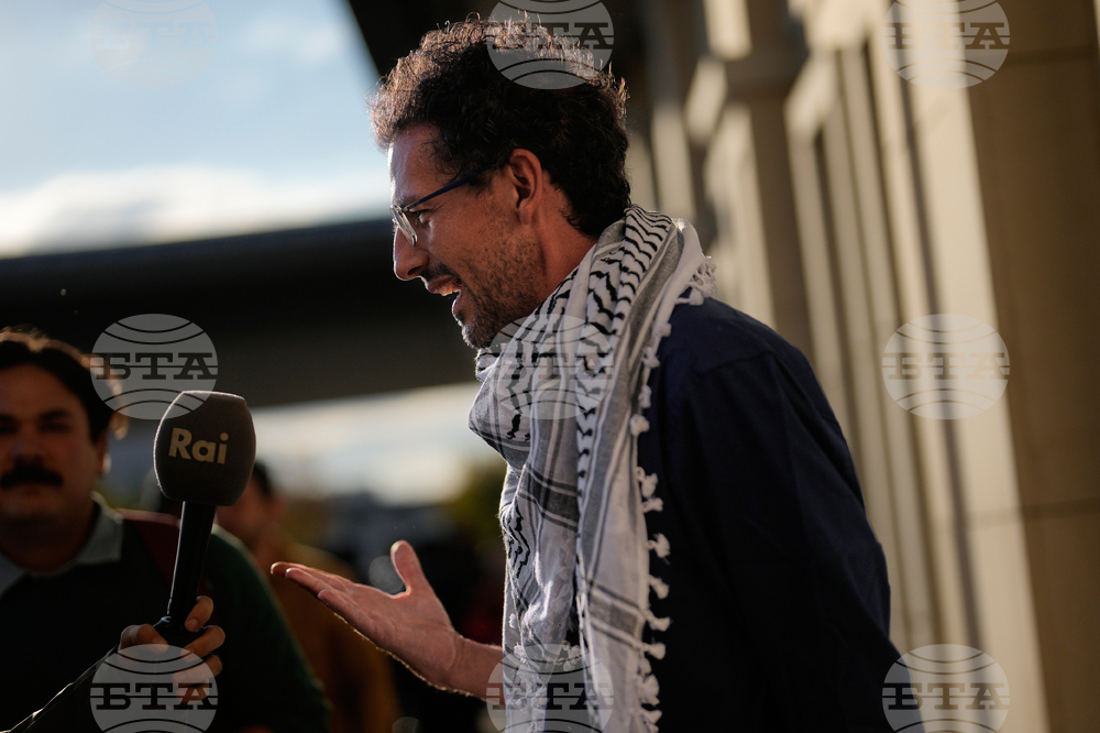 Lorenzo D'Agostino, of Italy, speaks to the media after arriving in Istanbul, Turkey, with 137 activists from the Global Sumud Flotilla, Saturday, Oct. 4, 2025. (AP Photo/Khalil Hamra)