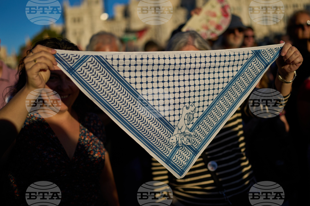 Pro-Palestinian demonstrators rally during a protest in Madrid, Spain, Saturday, Oct. 4, 2025, calling for an end to the war in Gaza. (AP Photo/Bernat Armangue)