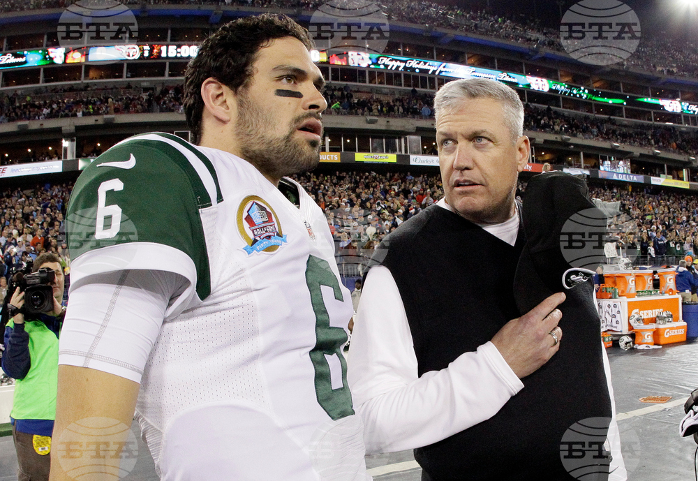 FILE - New York Jets head coach Rex Ryan, right, talks with quarterback Mark Sanchez (6) before an NFL football game between the Tennessee Titans and the New York Jets on Monday, Dec. 17, 2012, in Nashville, Tenn. (AP Photo/Wade Payne, File)