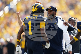Michigan head coach Sherrone Moore, right, greets wide receiver Donaven McCulley on the sideline during the second half of an NCAA college football game against Wisconsin, Saturday, Oct. 4, 2025, in Ann Arbor, Mich. (AP Photo/Ryan Sun)