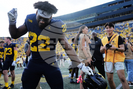 Michigan running back Justice Haynes celebrates after the team's win in an NCAA college football game against Wisconsin, Saturday, Oct. 4, 2025, in Ann Arbor, Mich. (AP Photo/Ryan Sun)