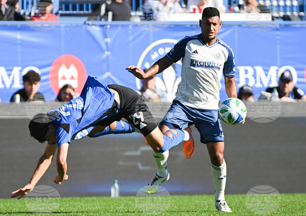 Nashville SC's Jack Maher, left, and CF Montreal's Prince Owusu battle for the ball during the first half of an MLS soccer game in Montreal, Saturday, Oct. 4, 2025. (Graham Hughes/The Canadian Press via AP)
