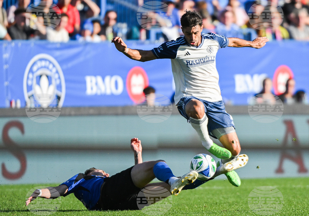 Nashville SC's Sam Surridge, right, scores against CF Montreal during the second half of an MLS soccer game in Montreal, Saturday, Oct. 4, 2025. (Graham Hughes/The Canadian Press via AP)