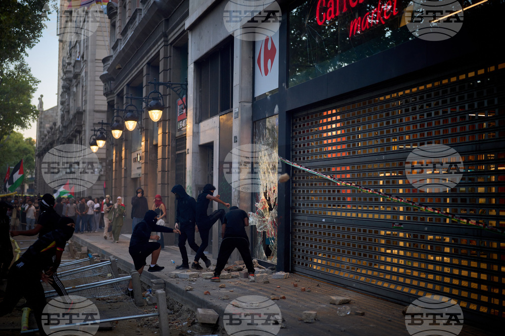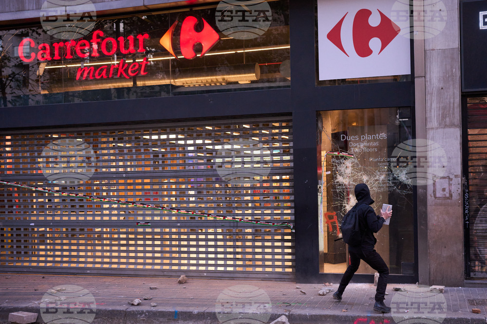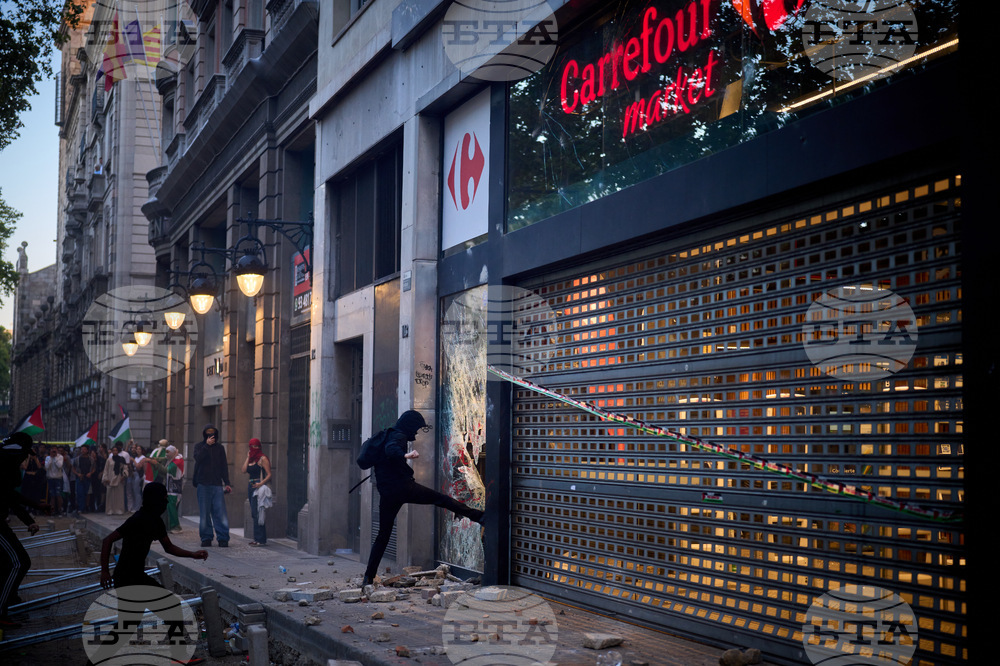Protesters vandalize a Carrefour store during a pro-Palestinian rally in solidarity with the Global Sumud Flotilla after ships were intercepted by the Israeli navy, in Barcelona, Spain, Saturday, Oct. 4, 2025. (AP Photo/Emilio Morenatti)