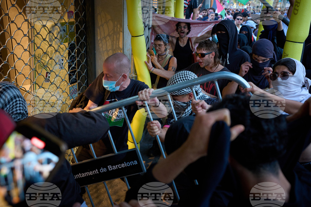 Protesters use a fence to try to break the entrance to a McDonald's during a pro-Palestinian rally in solidarity with the Global Sumud Flotilla after ships were intercepted by the Israeli navy, in Barcelona, Spain, Saturday, Oct. 4, 2025. (AP Photo/Emilio Morenatti)