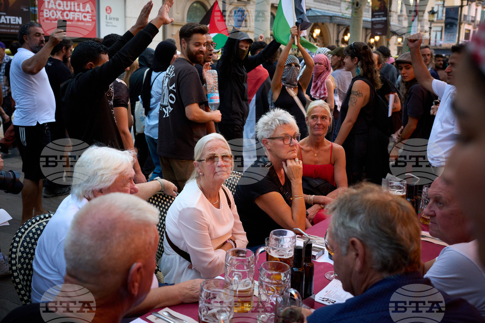 Tourists watch as protesters pass by during a pro-Palestinian rally in solidarity with the Global Sumud Flotilla after ships were intercepted by the Israeli navy, in Barcelona, Spain, Saturday, Oct. 4, 2025. (AP Photo/Emilio Morenatti)
