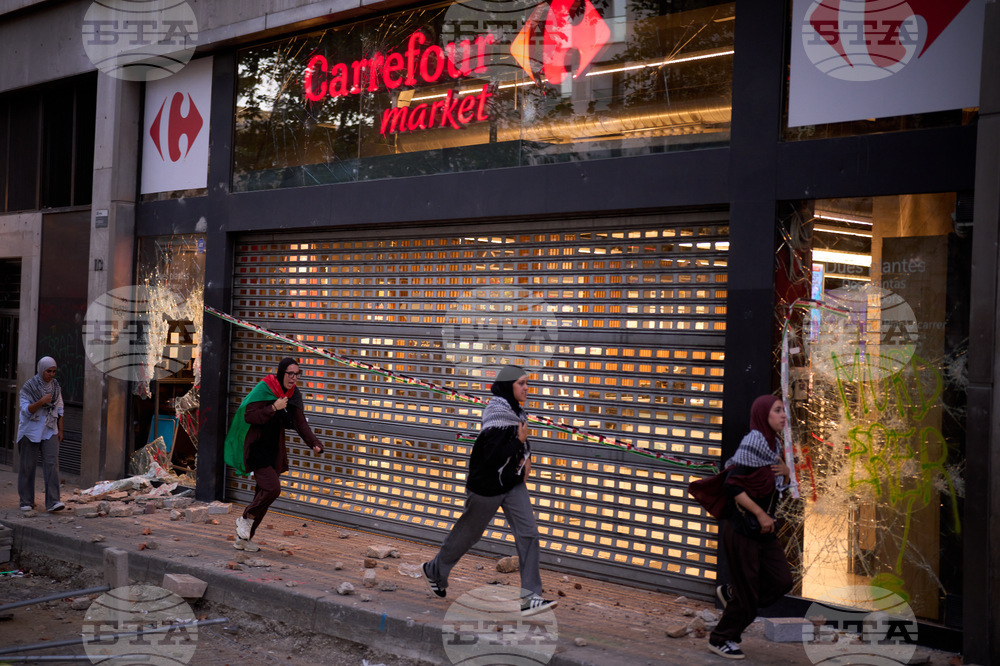 Protesters run past a destroyed entrance to Carrefour during a pro-Palestinian rally in solidarity with the Global Sumud Flotilla after ships were intercepted by the Israeli navy, in Barcelona, Spain, Saturday, Oct. 4, 2025. (AP Photo/Emilio Morenatti)