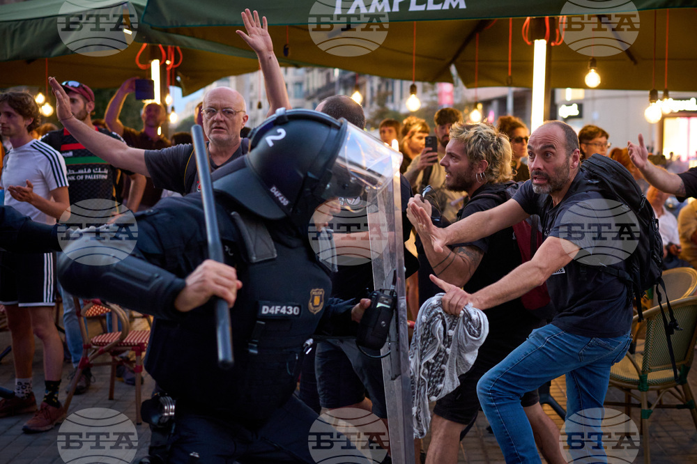 Police officers clash with protesters during a pro-Palestinian rally in solidarity with the Global Sumud Flotilla after ships were intercepted by the Israeli navy, in Barcelona, Spain, Saturday, Oct. 4, 2025. (AP Photo/Emilio Morenatti)