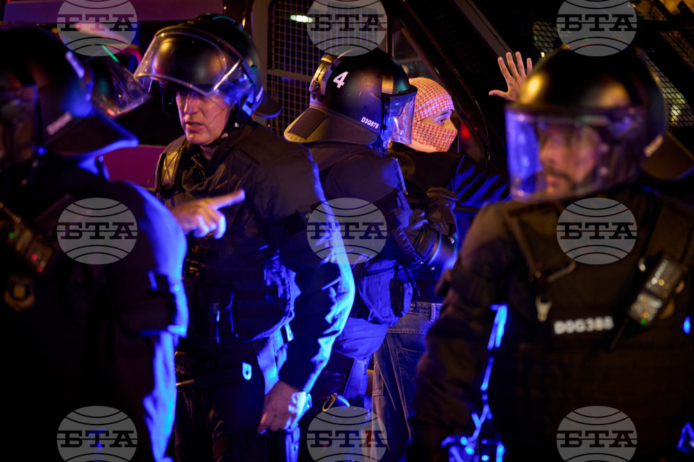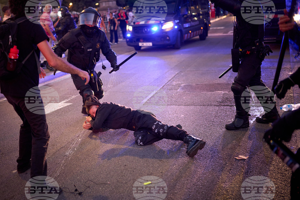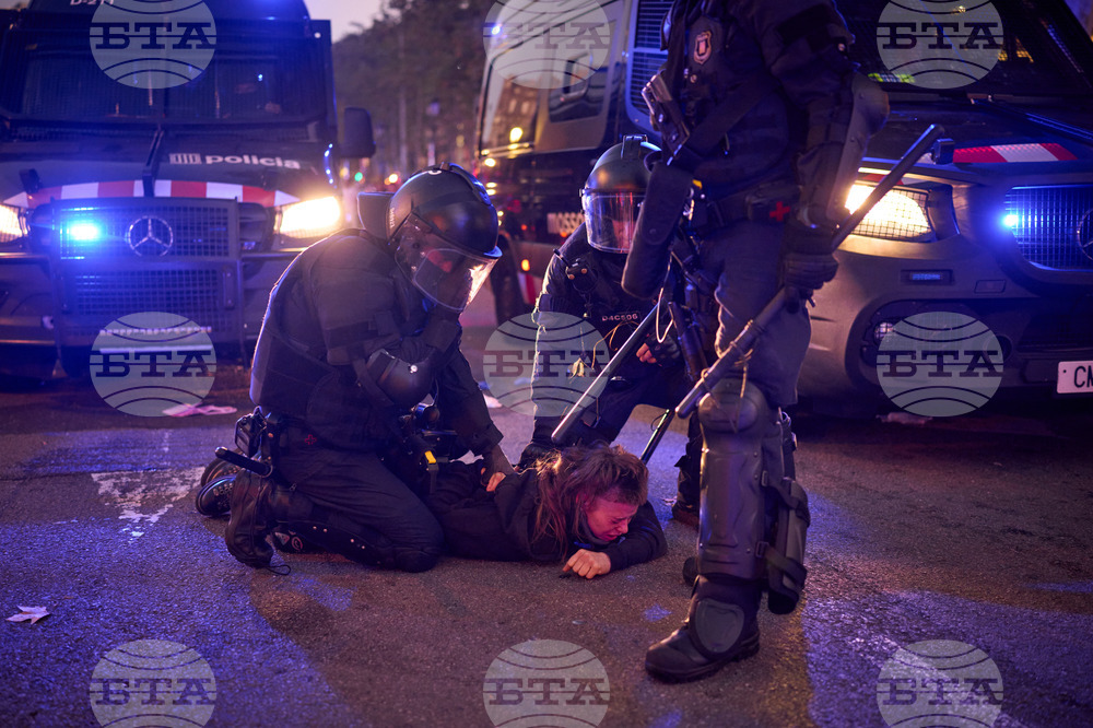 Police officers take positions as they clash with protesters during a pro-Palestinian rally in solidarity with the Global Sumud Flotilla after ships were intercepted by the Israeli navy, in Barcelona, Spain, Saturday, Oct. 4, 2025. (AP Photo/Emilio Morenatti)