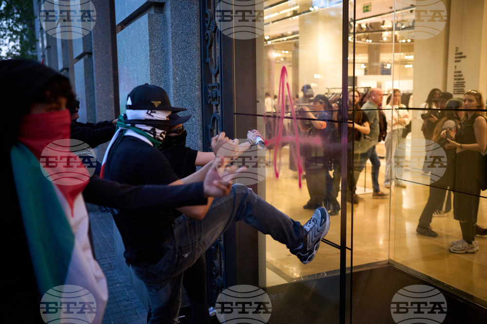 Protesters attempt to break into a Zara store during a pro-Palestinian rally in solidarity with the Global Sumud Flotilla after ships were intercepted by the Israeli navy, in Barcelona, Spain, Saturday, Oct. 4, 2025. (AP Photo/Emilio Morenatti)