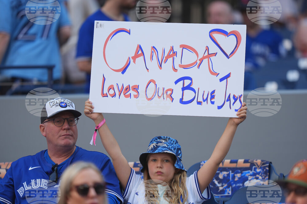 A Toronto Blue Jays fan holds up a sign ahead of the start before Game 1 of baseball's American League Division Series against the New York Yankees in Toronto, Saturday, Oct. 4, 2025. (Frank Gunn/The Canadian Press via AP)