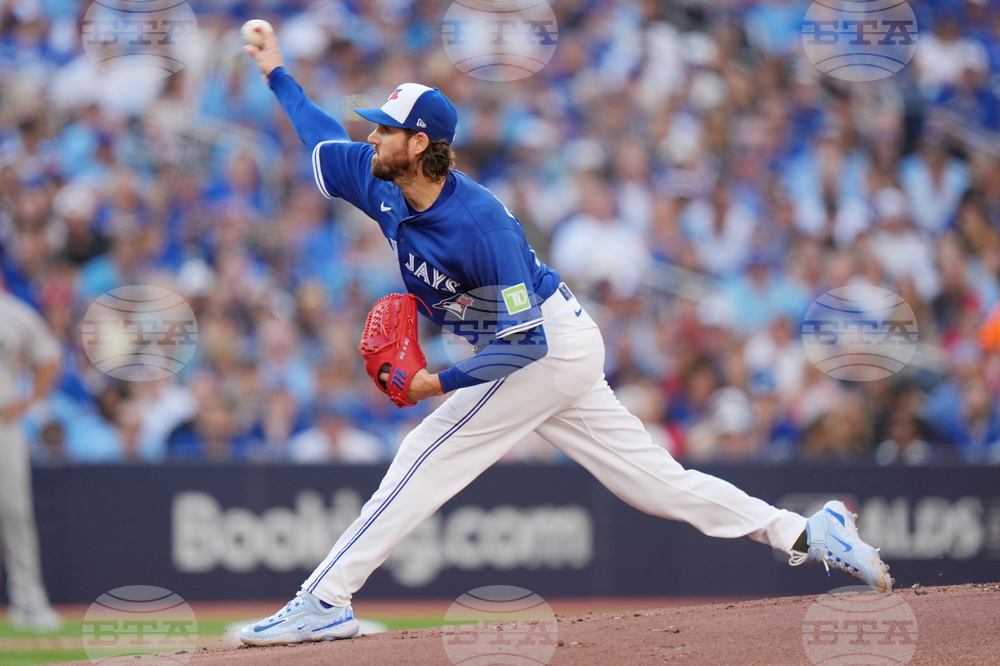 Toronto Blue Jays pitcher Kevin Gausman delivers to the New York Yankees during the fourth inning in Game 1 of baseball's American League Division Series, Saturday, Oct. 4, 2025, in Toronto. (Nathan Denette/The Canadian Press via AP)