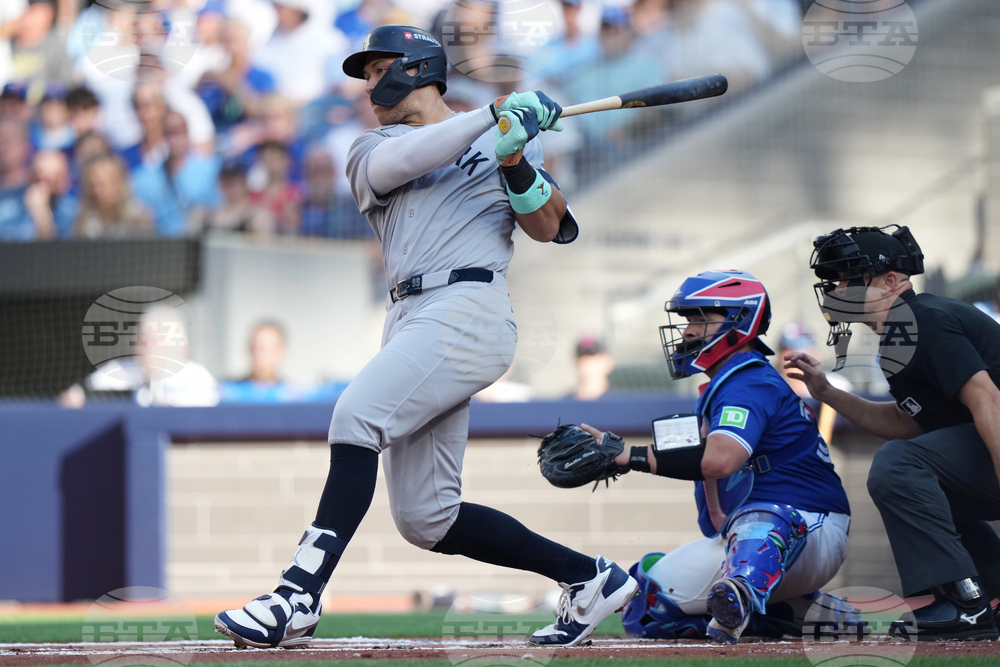 New York Yankees' Aaron Judge (99) hits a single against the Toronto Blue Jays in Game 1 of baseball's American League Division Series, Saturday, Oct. 4, 2025, in Toronto. (Nathan Denette/The Canadian Press via AP)
