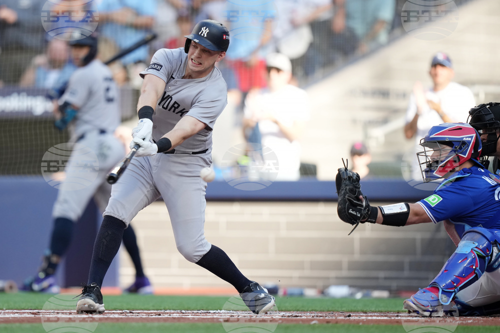 Players listen to the Canadian national anthem before Game 1 of baseball's American League Division Series between Toronto Blue Jays and the New York Yankees in Toronto, Saturday, Oct. 4, 2025. Frank Gunn/The Canadian Press via AP)