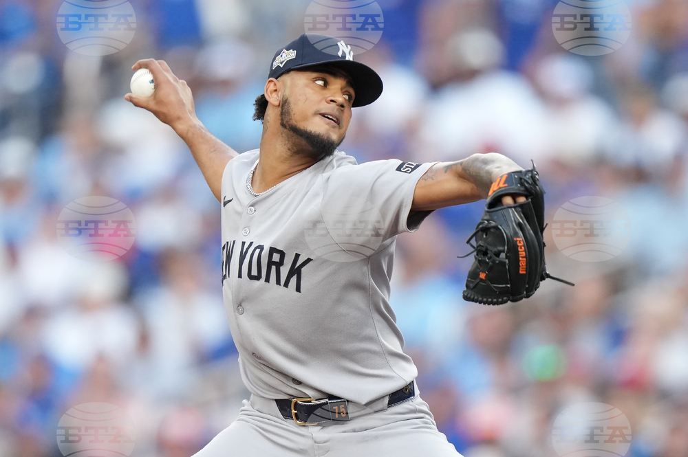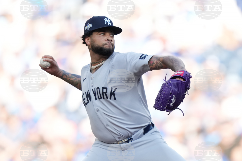 New York Yankees pitcher Camilo Doval delivers a pitch during the fifth inning against the Toronto Blue Jays in Game 1 of baseball's American League Division Series, Saturday, Oct. 4, 2025, in Toronto. (Frank Gunn/The Canadian Press via AP)