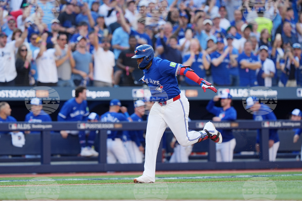 Toronto Blue Jays Vladimir Guerrero Jr. (27) rounds second base after hitting a home run against the New York Yankees during the first inning in Game 1 of baseball's American League Division Series, Saturday, Oct. 4, 2025, in Toronto. (Chris Young/The Canadian Press via AP)