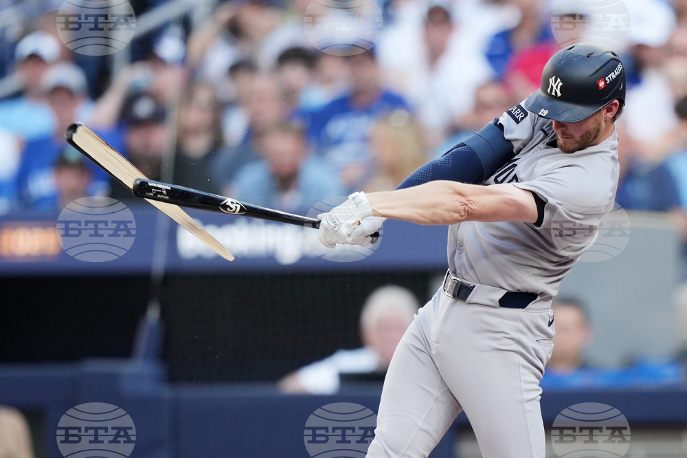 New York Yankees' Ryan McMahon (19) breaks his bat as he lines out into a double play during the second inning against the New York Yankees during the first inning in Game 1 of baseball's American League Division Series, Saturday, Oct. 4, 2025, in Toronto. (Nathan Denette/The Canadian Press via AP)