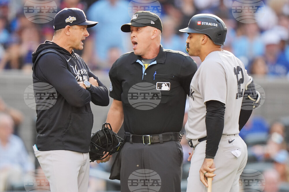 New York Yankees manager Aaron Boone talks to the umpires about an out call on Trent Grisham (12) during the first inning against the Toronto Blue Jays in Game 1 of baseball's American League Division Series, Saturday, Oct. 4, 2025, in Toronto. (Chris Young/The Canadian Press via AP)