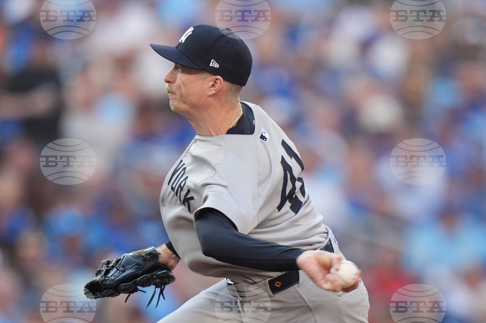 New York Yankees pitcher Tim Hill delivers against the Toronto Blue Jays during the fourth inning in Game 1 of baseball's American League Division Series, Saturday, Oct. 4, 2025, in Toronto. (Frank Gunn/The Canadian Press via AP)
