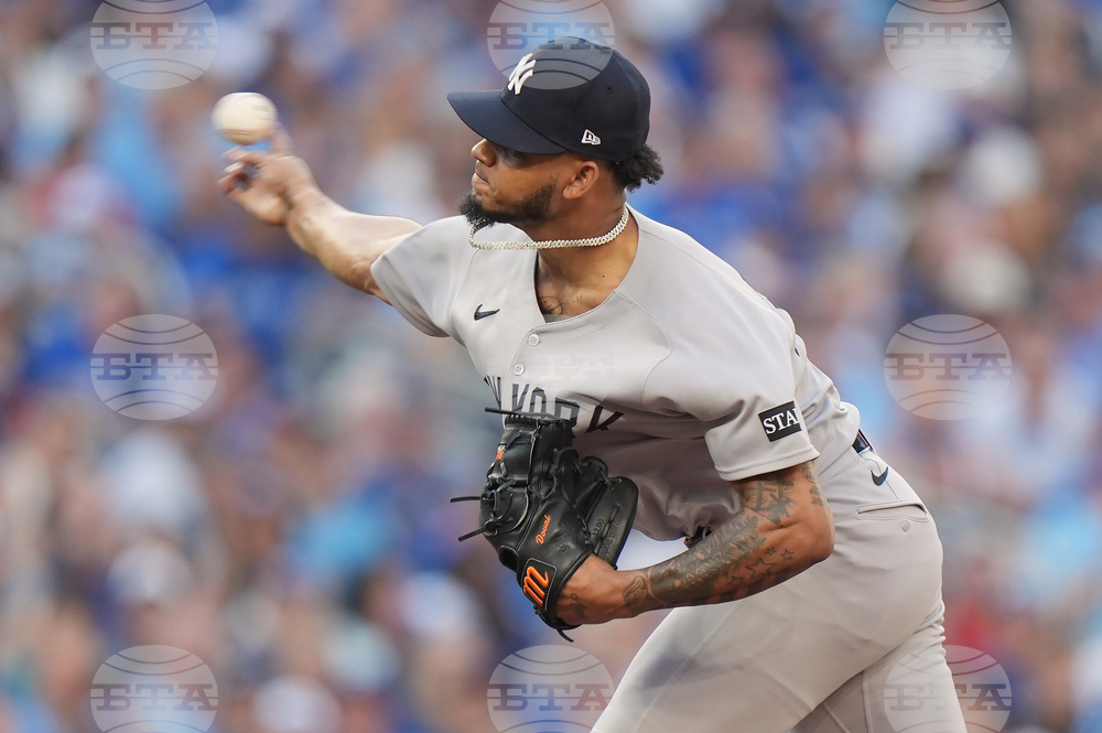 New York Yankees starting pitcher Luis Gil (81) throws during the first inning against the Toronto Blue Jays in Game 1 of baseball's American League Division Series, Saturday, Oct. 4, 2025, in Toronto. (Frank Gunn/The Canadian Press via AP)