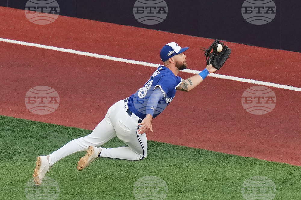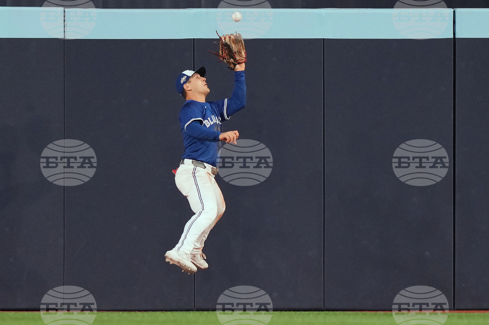 Toronto Blue Jays centre fielder Daulton Varsho (5) makes a catch on a fly out hit by New York Yankees' Ben Rice during the eighth inning in Game 1 of baseball's American League Division Series, Saturday, Oct. 4, 2025, in Toronto. (Nathan Denette/The Canadian Press via AP)