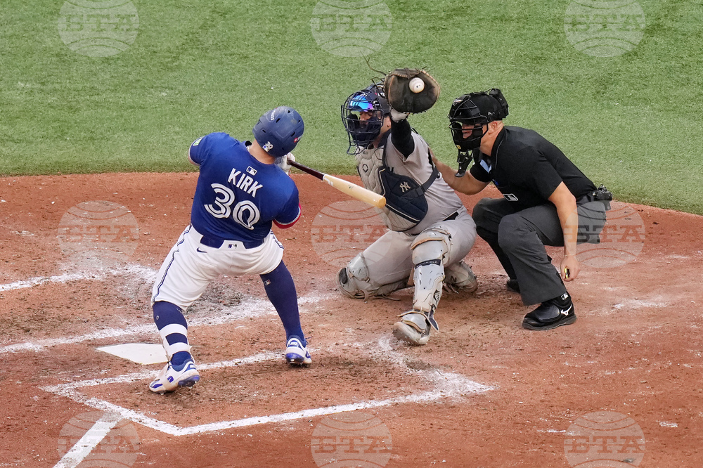 Toronto Blue Jays' Alejandro Kirk (30) gets out of the way of a high and inside pitch during the sixth inning against the New York Yankees in Game 1 of baseball's American League Division Series, Saturday, Oct. 4, 2025, in Toronto. (Frank Gunn/The Canadian Press via AP)