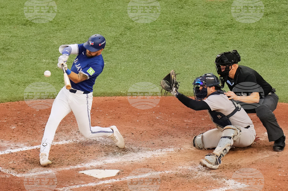 New York Yankees' Ben Rice (22) strikes out against the Toronto Blue Jays during the first inning in Game 1 of baseball's American League Division Series, Saturday, Oct. 4, 2025, in Toronto. (Nathan Denette/The Canadian Press via AP)