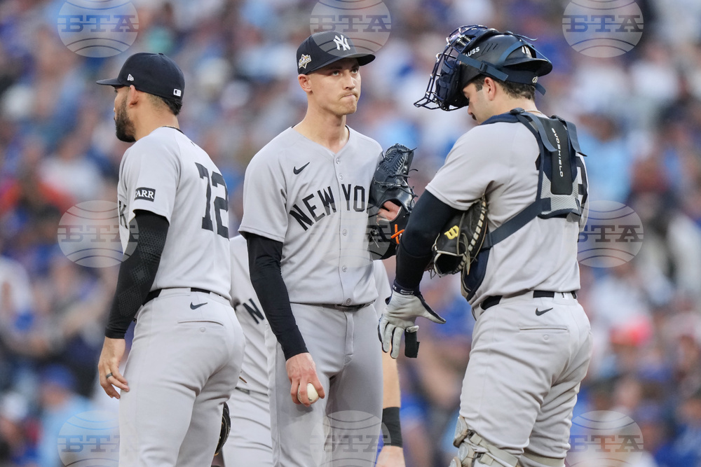 New York Yankees pitcher Luke Weaver, center, waits to be removed during the seventh inning against the Toronto Blue Jays in Game 1 of baseball's American League Division Series, Saturday, Oct. 4, 2025, in Toronto. (Nathan Denette/The Canadian Press via AP)