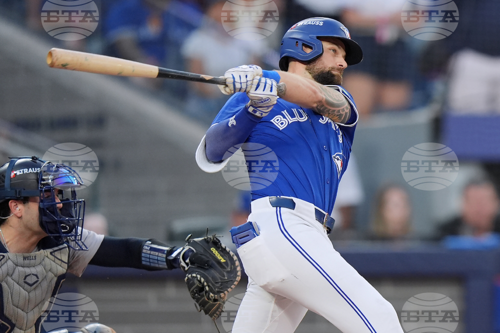 Toronto Blue Jays' Vladimir Guerrero Jr. (27) and George Springer (4) react after Guerrero Jr.'s RBI sacrifice fly out against the New York Yankees during the seventh inning in Game 1 of baseball's American League Division Series, Saturday, Oct. 4, 2025, in Toronto. (Nathan Denette/The Canadian Press via AP)