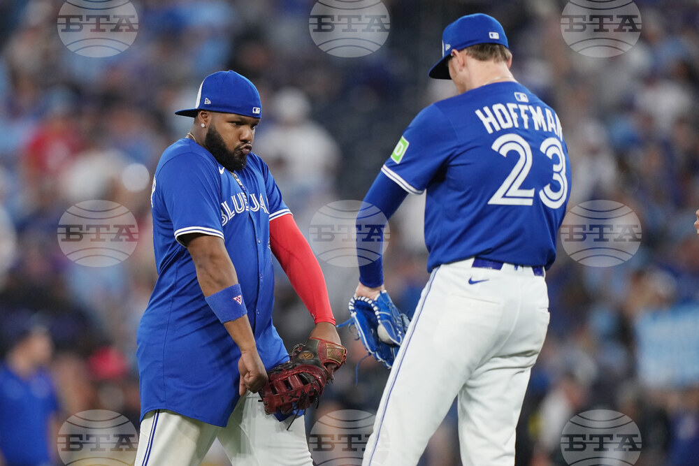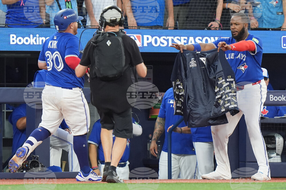Toronto Blue Jays' Vladimir Guerrero Jr. (27) and pitcher Jeff Hoffman (23) celebrate after defeating the New York Yankee in Game 1 of baseball's American League Division Series, Saturday, Oct. 4, 2025, in Toronto. (Nathan Denette/The Canadian Press via AP)
