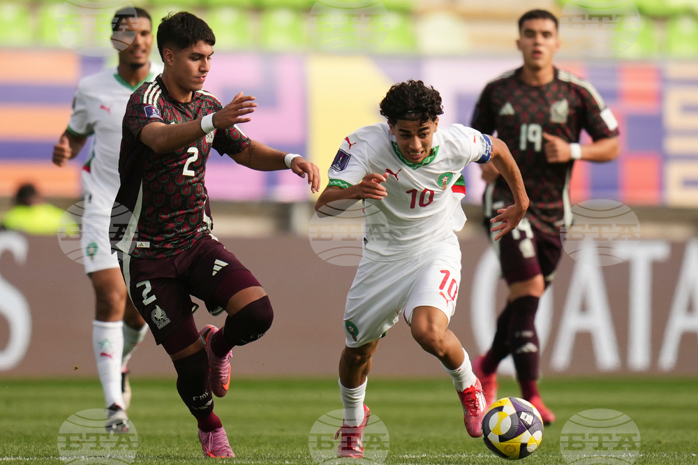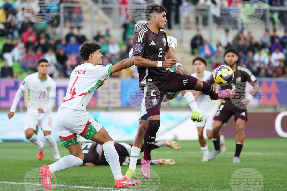 Mexico's Cesar Bustos, right, and Morocco's Mohammed Kebdani battle for the ball during a FIFA U-20 World Cup Group C soccer match at Elias Figueroa Brander Stadium in Valparaiso, Chile, Saturday, Oct. 4, 2025. (AP Photo/Andre Penner)
