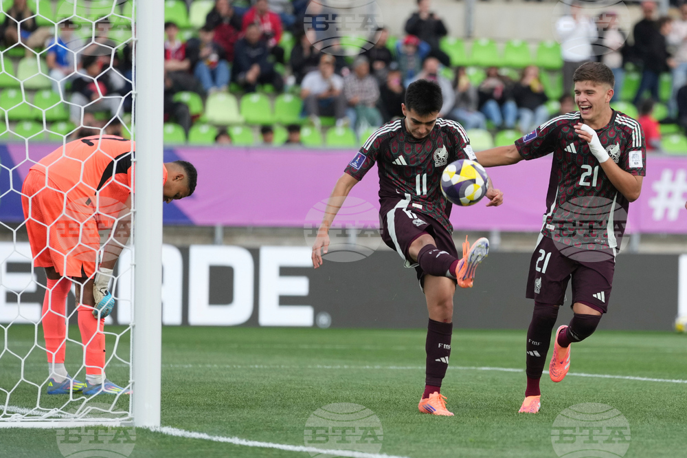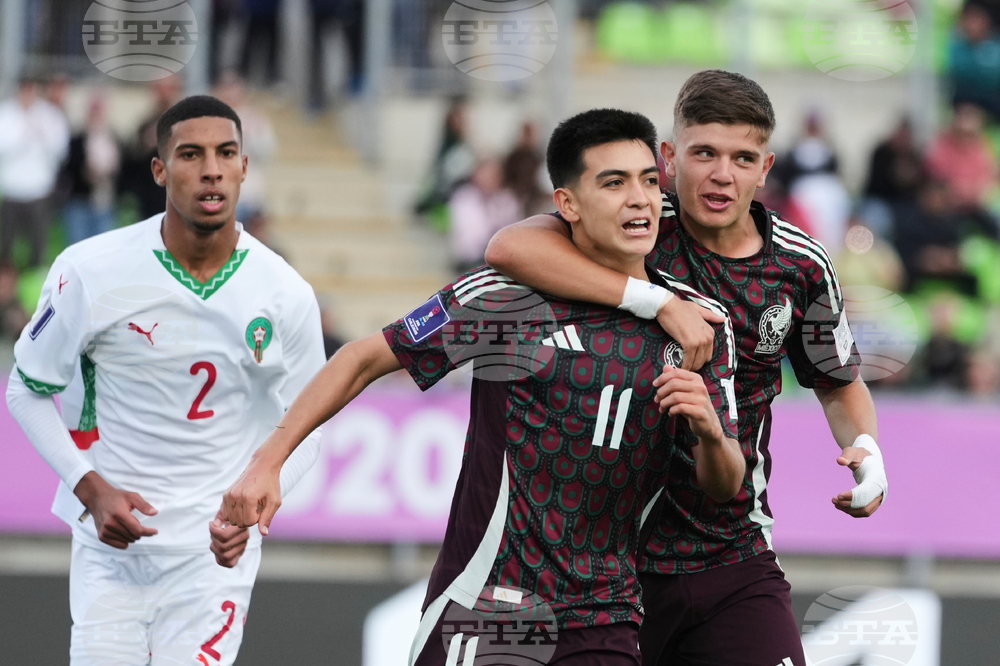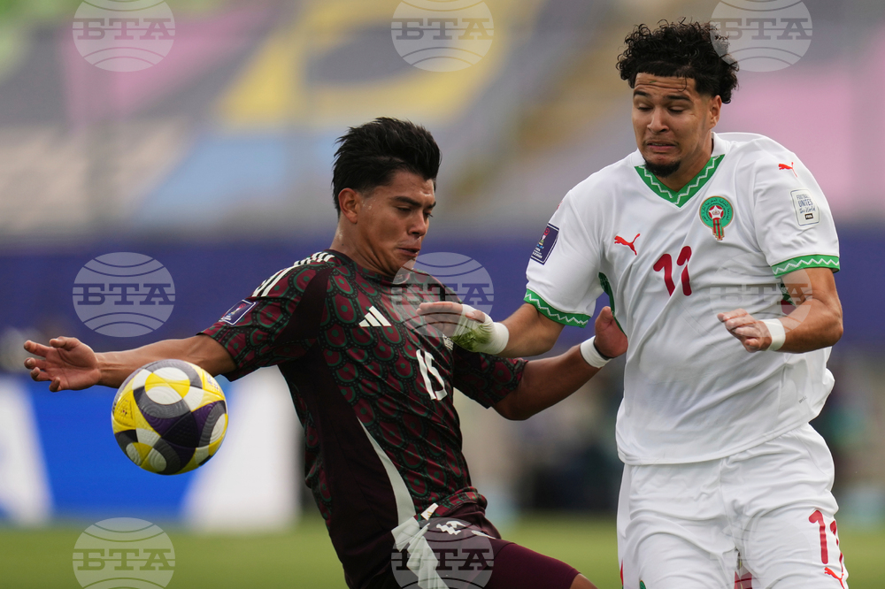 Mexico's Oswaldo Virgen (9) and Morocco's Houssam Essadak fight for the ball during a FIFA U-20 World Cup Group C soccer match at Elias Figueroa Brander Stadium in Valparaiso, Chile, Saturday, Oct. 4, 2025. (AP Photo/Andre Penner)