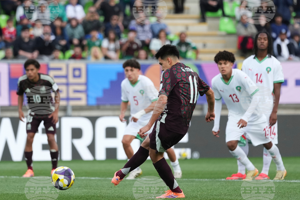 Mexico's Gilberto Mora (11) scores his side's first goal against Morocco from the penalty spot during a FIFA U-20 World Cup Group C soccer match at Elias Figueroa Brander Stadium in Valparaiso, Chile, Saturday, Oct. 4, 2025. (AP Photo/Andre Penner)
