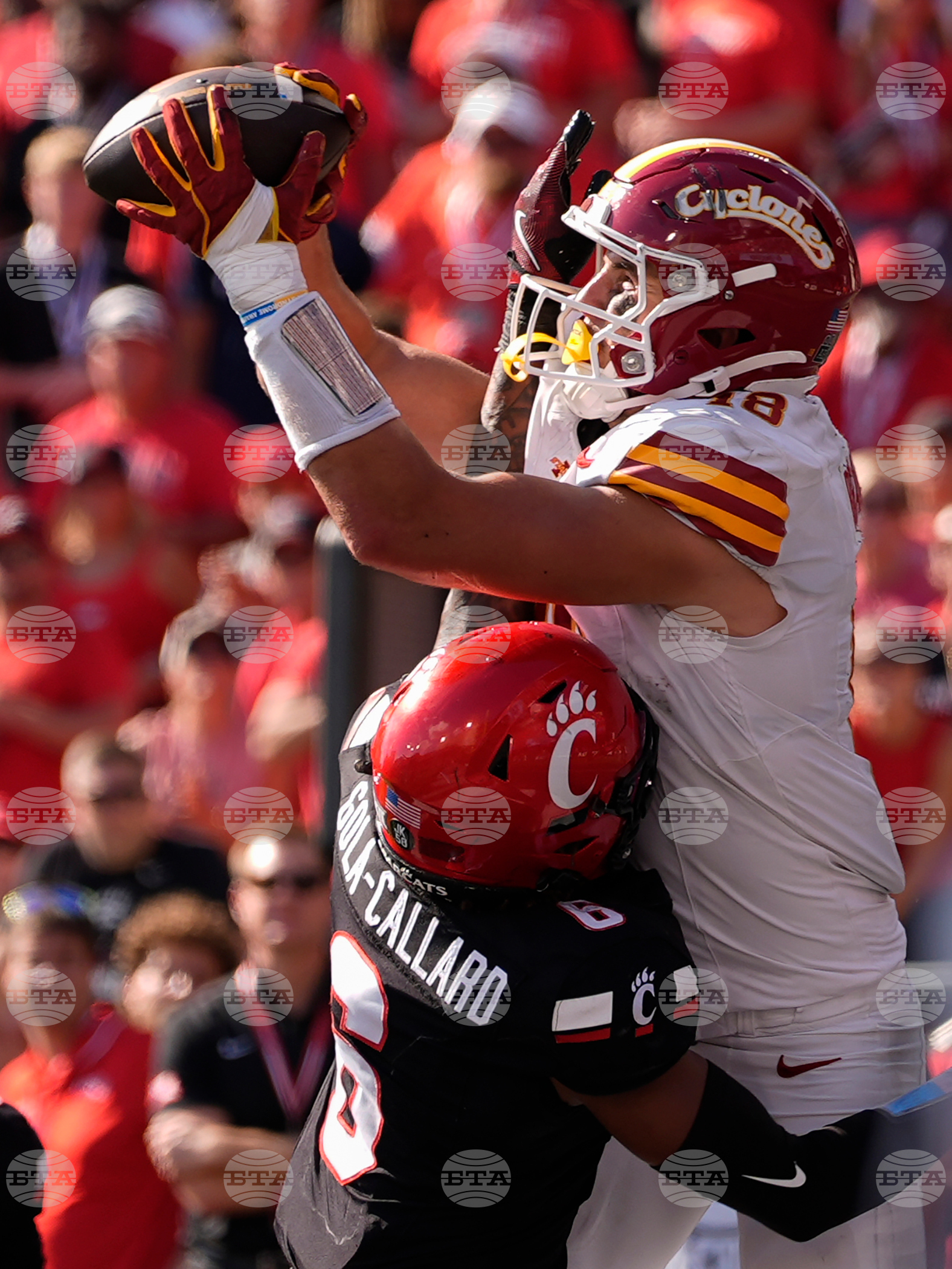 Iowa State tight end Benjamin Brahmer (18) catches a two-point conversion over Cincinnati defensive back Tre Gola-Callard (6) during the second half of an NCAA college football game, Saturday, Oct. 4, 2025, in Cincinnati. (AP Photo/Carolyn Kaster)
