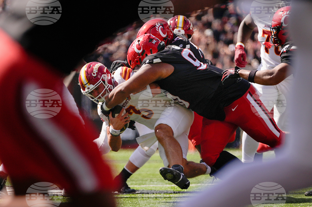 Iowa State quarterback Rocco Becht (3) is sacked by Cincinnati defensive lineman Jalen Hunt (90) during the first half of an NCAA college football game, Saturday, Oct. 4, 2025, in Cincinnati. (AP Photo/Carolyn Kaster)