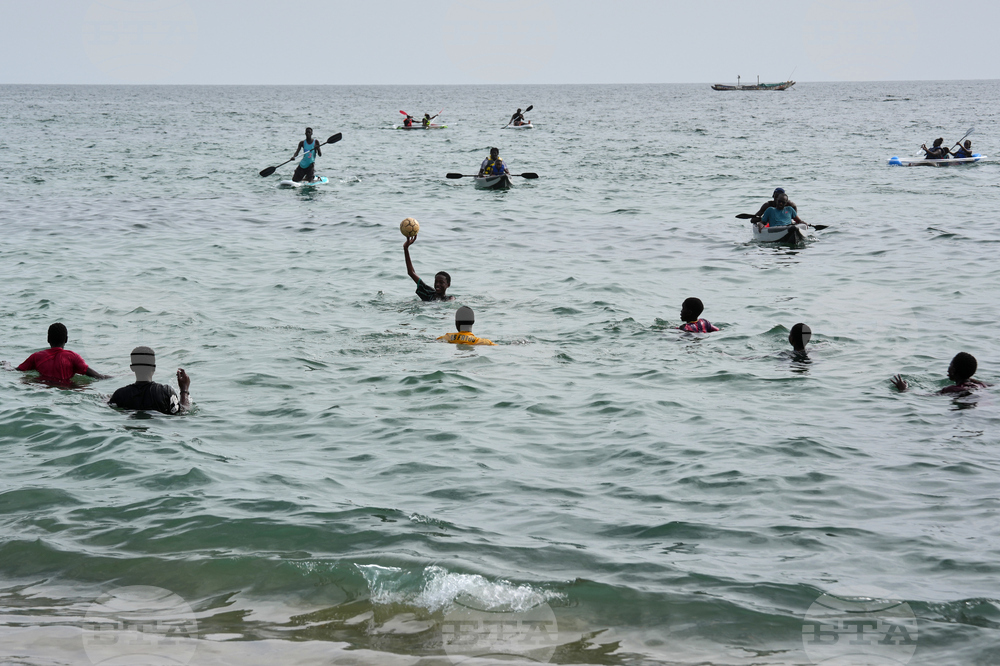 Children play as people paddle kayaks in the ocean along the shore of Dakar, Senegal, Saturday, Oct. 4, 2025 (AP Photo/Misper Apawu)