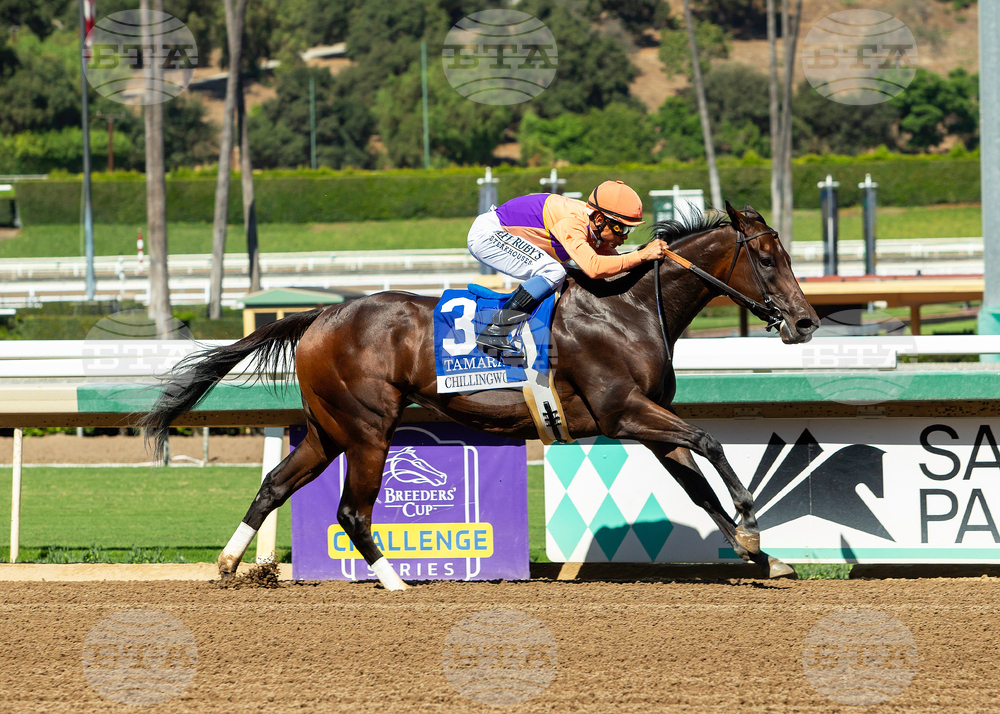 In a photo provided by Benoit Photo, Spendthrift Farm's Tamara and jockey Mike Smith win the Grade III $100,000 Chillingworth Stakes Saturday, October 4, 2025 at Santa Anita Park, Arcadia, Calif. (Benoit Photo via AP)