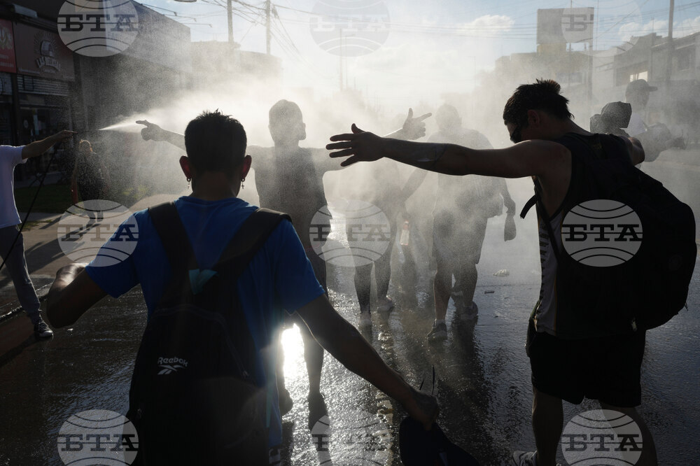 A person sprays water on pilgrims as they walk during the annual procession to the Basilica of the Virgin of Luján, Argentina's patron saint, in Buenos Aires, Argentina, Saturday, Oct. 4, 2025. (AP Photo/Rodrigo Abd)