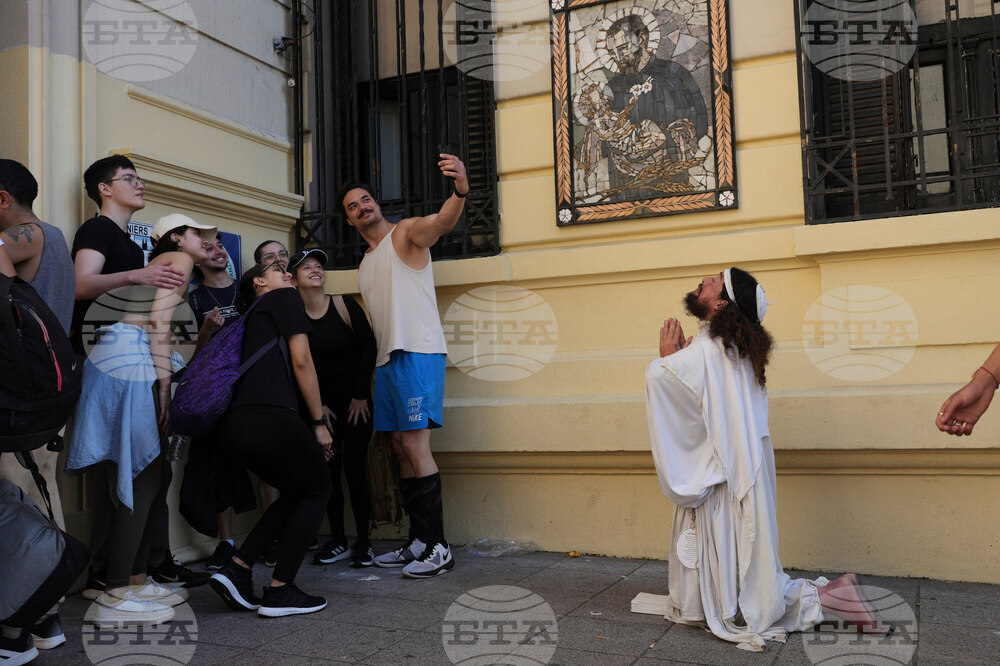 A pilgrim prays outside the church of San Cayetano, while other take a selfie, before taking part in the annual procession to the Basilica of the Virgin of Luján, Argentina's patron saint, in Buenos Aires, Argentina, Saturday, Oct. 4, 2025. (AP Photo/Rodrigo Abd)