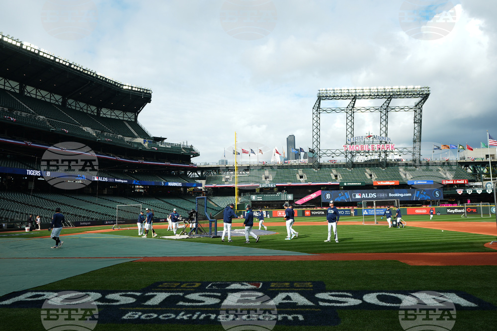 The Seattle Mariners take batting practice before Game 1 of baseball's American League Division Series against the Detroit Tigers, Saturday, Oct. 4, 2025, in Seattle. (AP Photo/Lindsey Wasson)